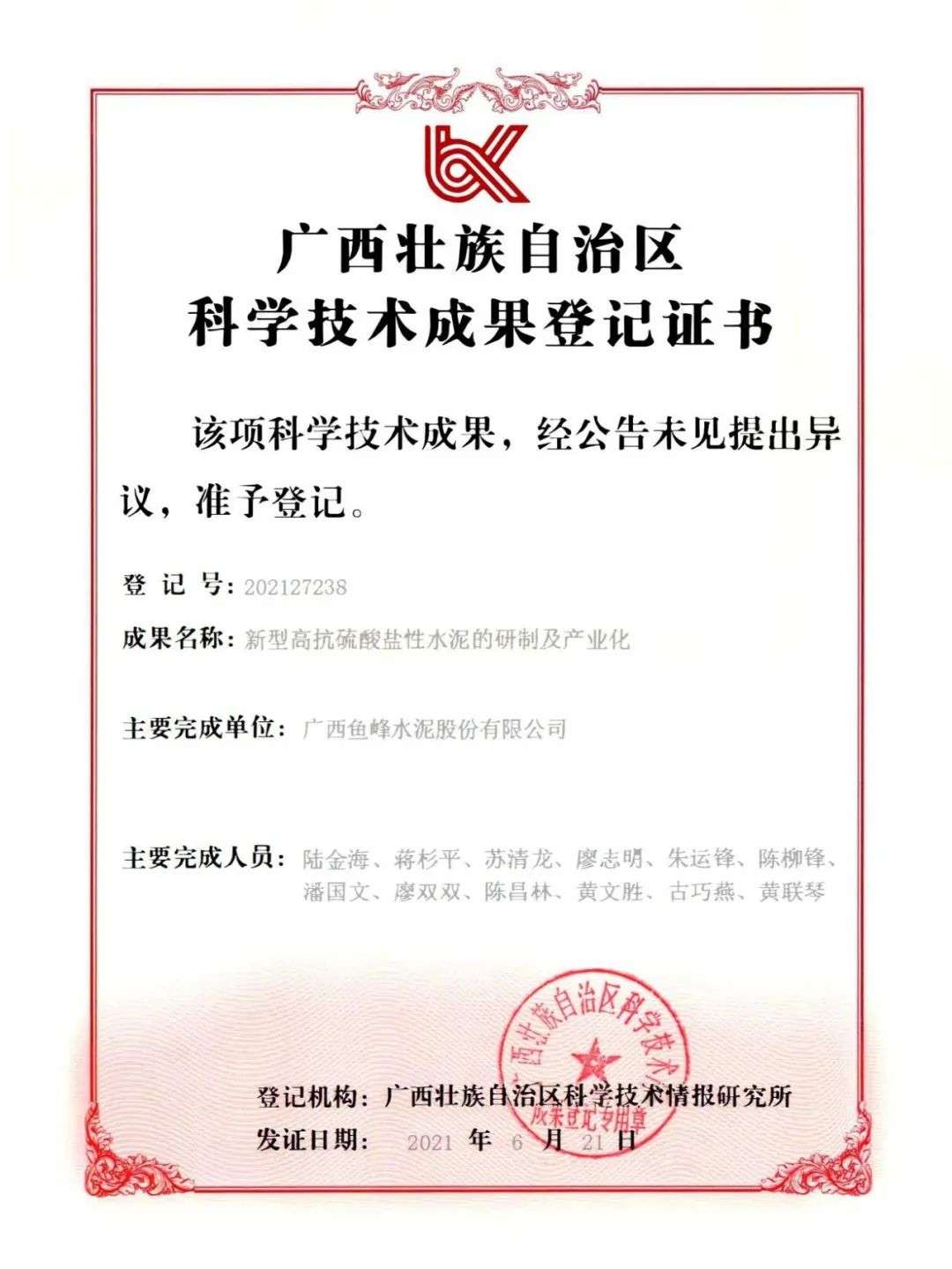北部湾港集团旗下鱼峰集团好事成双,《工业固废制备优质胶凝材料关键技术及其应用》获得广西科学技术进步奖一等奖,《新型高抗硫酸盐性水泥研发关键技术及产业化》荣获科学技术进步三等奖。