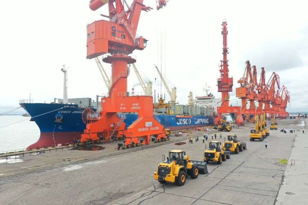 7月11日,产自广西柳工的132辆装载机、压路机及挖掘机等9类工程机械在钦州港大榄坪作业区北1#泊位整齐列队,以“群虎出山”之势搭乘“中远井冈山 ”轮顺利出口澳大利亚和印度尼西亚2个RCEP成员国。