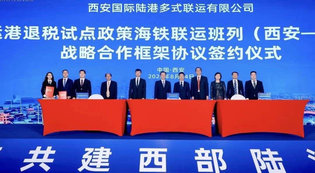 推介会现场,两省区相关单位和企业代表进行专题推介和发言,举行陆路启运港退税试点政策海铁联运班列(西安—北部湾港)战略合作框架协议签订仪式,宣布了西部陆海新通道(西安—北部湾港)海铁联运班列常态化开行。