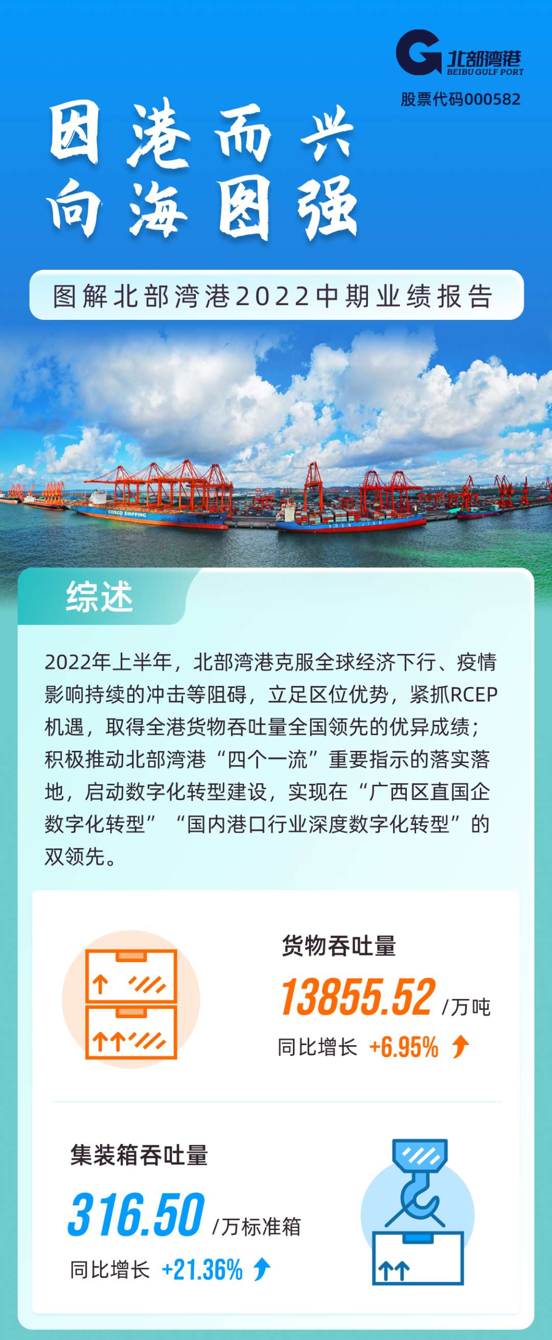 8月20日,北部湾港(000582)发布了2022年半年度报告。今年上半年,北部湾港股份以高质量党建引领高质量发展,公司上下对标年度生产经营任务目标,强化生产经营管理,迎难而上、齐心协力、顽强拼搏,生产经营成绩保持稳步增长。