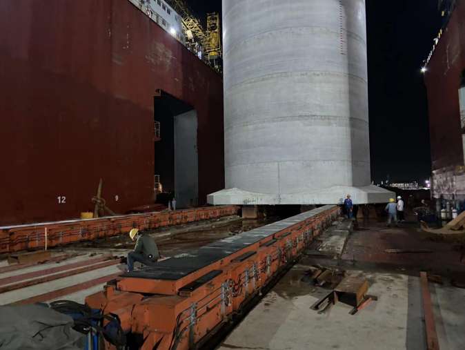 为安全、高效完成沉箱出运安装任务,沉箱出运采用行业领先的电驱顶运一体化台车移运工艺,全面取代传统气囊出运工艺,具有安全性能高、出运工序少、平移速度快等优势,施工效率提升1.5倍。