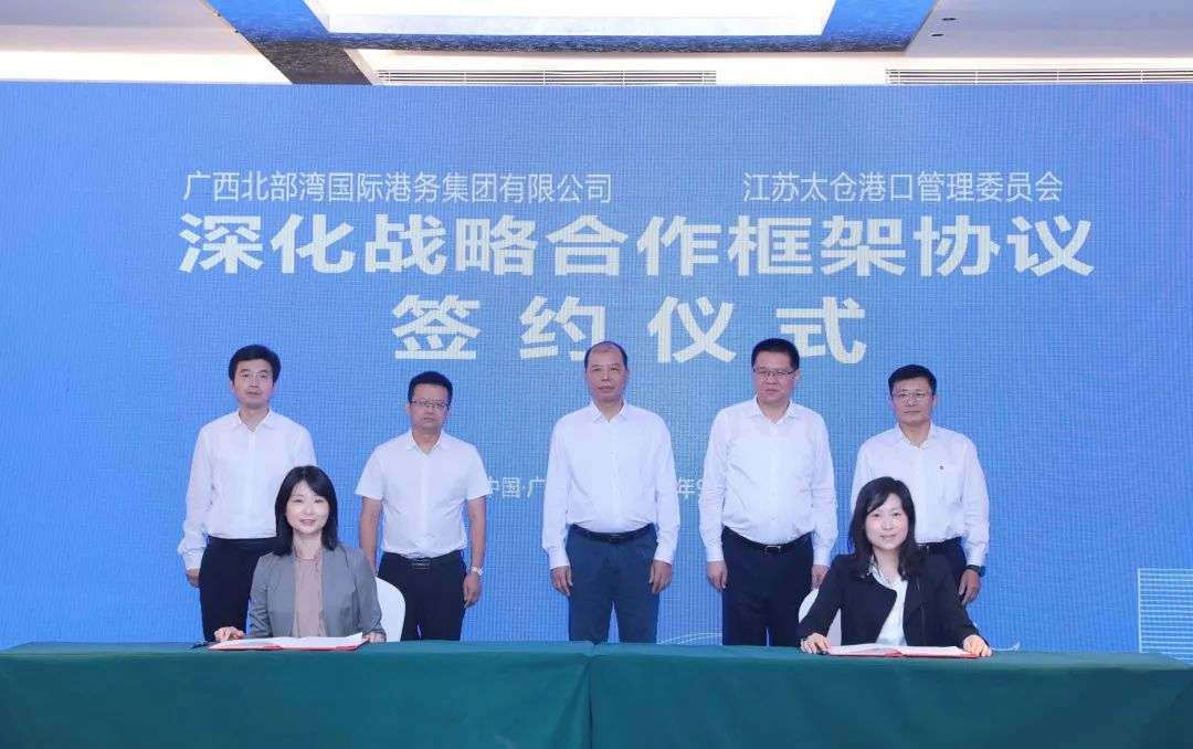 2022年9月15日下午,北部湾港集团与江苏太仓港口管委会签署关于深化战略合作的框架协议,合力打造两港物流新通道,共创江海转运新模式,拓展“海上丝绸之路”南向出海口,推动华东及广西区域经济内循环,促进两地经济健康稳定发展。