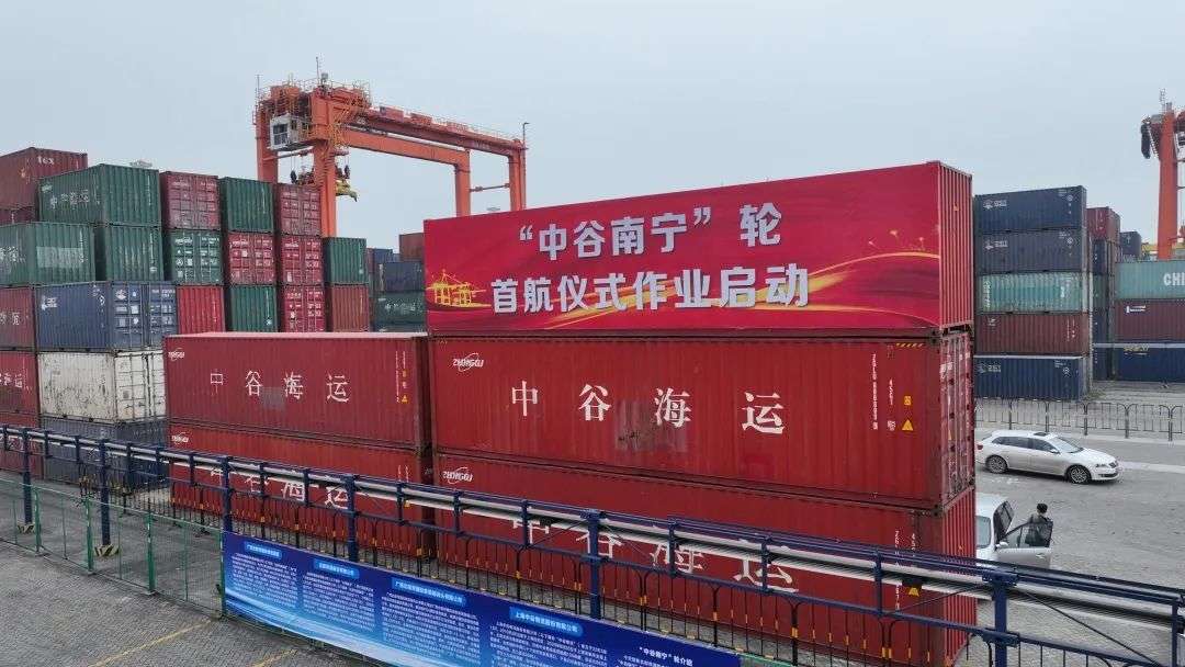 北部湾港集团党委委员、副董事长、副总经理 黄葆源在致辞中表示,中谷海运将其命名为“中谷南宁”轮,11月7日船舶下水后,满载货物奔赴千里首航北部湾港,它的到来,充分体现了中谷海运对北部湾港的高度重视和信任支持,彰显了对西部陆海新通道未来发展的坚定信心,推动中谷海运在北部湾港的常态化运力实现新突破,是北部湾港集装箱干线运输服务网络得到进一步完善、港口服务能力和核心竞争力进一步提升的重要体现,对巩固西部陆海新通道北部湾国际门户港、国际枢纽海港的战略地位具有十分重要的意义。