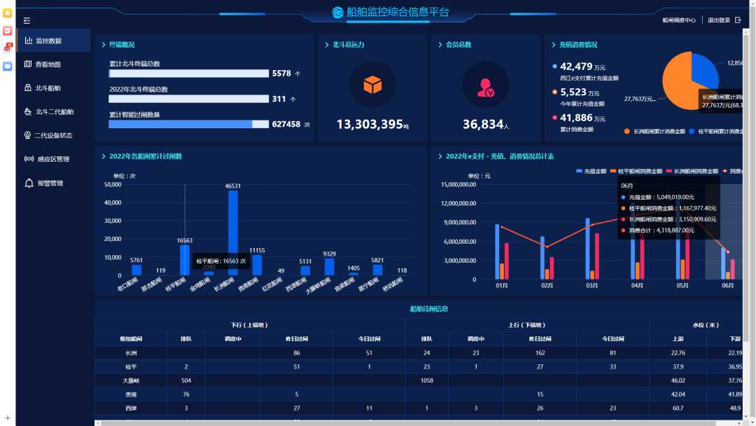 “千里眼”监控:建立了船闸机电监控管控一体化、闸室多目标监测感知、船闸水工建筑物安全在线监测诊断预警等模型,创新了防人字门夹船与浮式系船柱智能感知和闭锁控制技术,实现了西江多梯级多线船闸群的安全稳定高效运行。