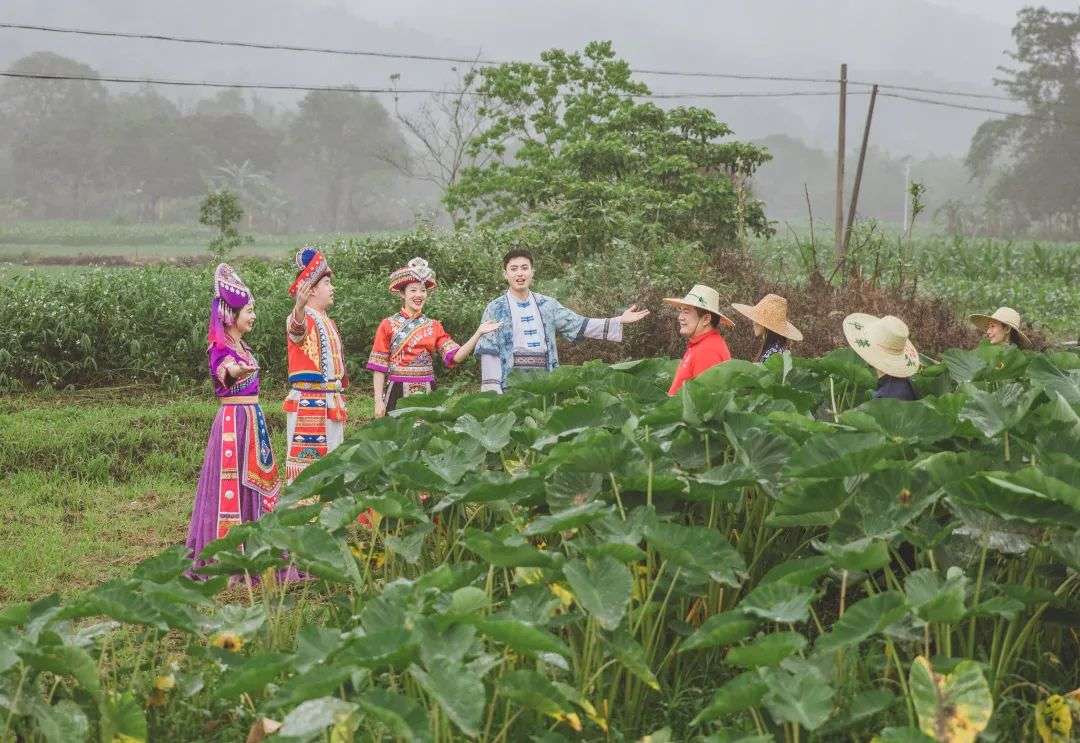 远处蔚蓝的天空下,涌动着成片墨绿的芋叶,在堆满淤泥的田间,芋蒙茁壮成长,阵阵清风吹来,将近1米高的芋叶犹如飘逸的裙摆摇曳摆动。那巴村第一书记和几位村民正在田里收割芋蒙梗和剥丝去皮,看到普法青年走过来,一边认真地干活,一边聆听普法的声音。