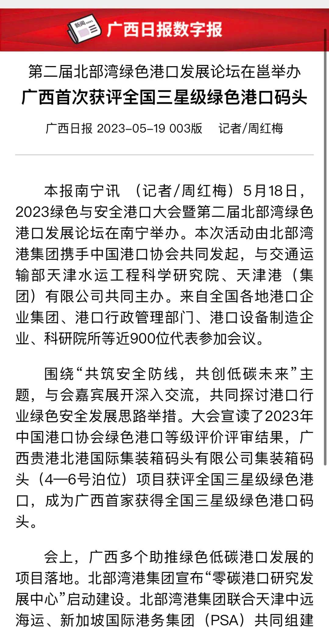 5月18日,由北部湾港集团携手中国港口协会共同发起,与交通运输部天津水运工程科学研究院、天津港(集团)有限公司共同主办的2023绿色与安全港口大会 第二届北部湾绿色港口发展论坛在南宁圆满落幕,亮眼的北部湾港绿色发展报告,振奋人心的“跨越发展中的北部湾港”视频,内容丰富的仪式活动,给与会人员留下了深刻而难忘的印象。