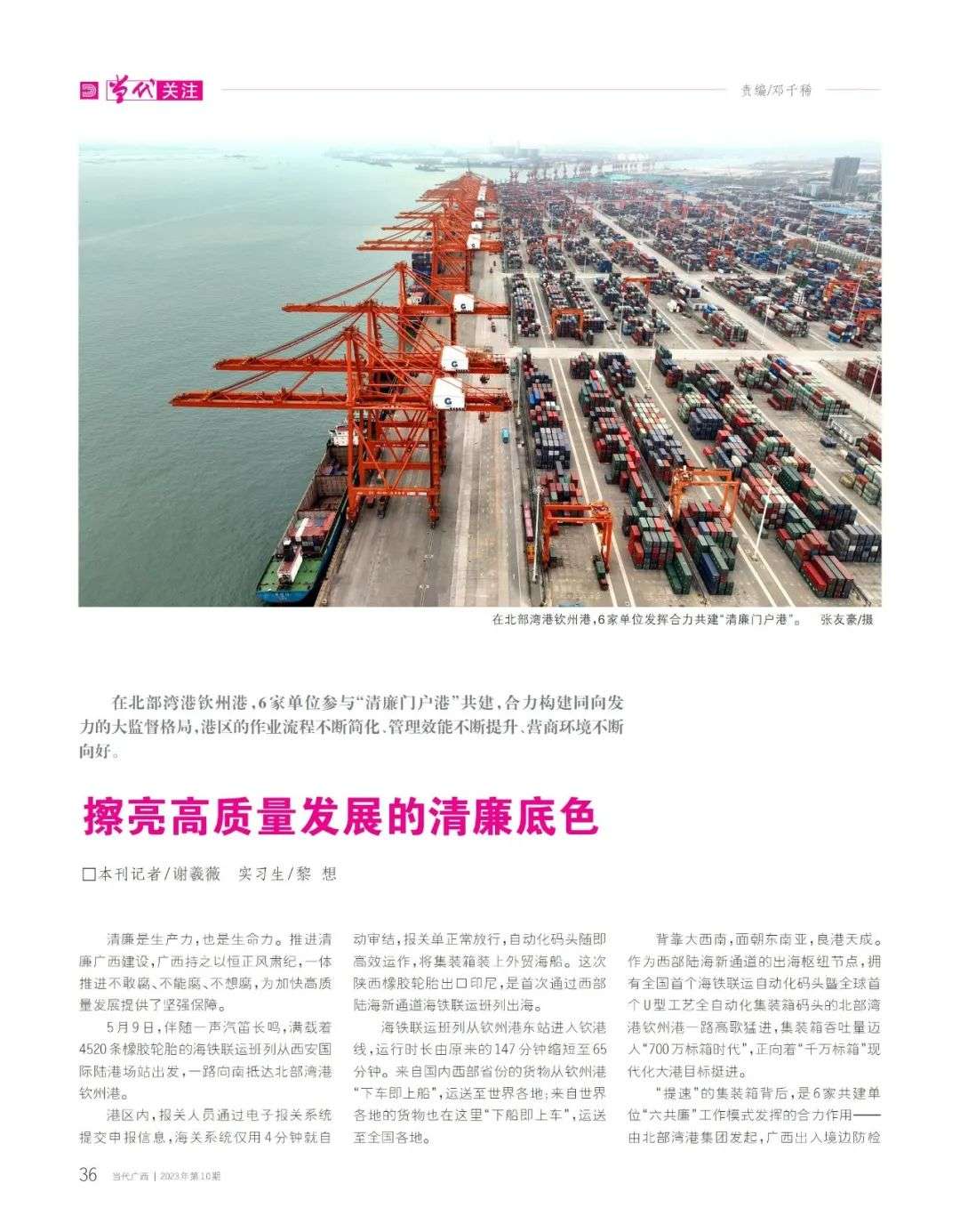 近日《当代广西》刊发了题目为《擦亮高质量发展的清廉底色》的文章,关注北部湾港集团深入推进“清廉”元素融入生产经营,以建设“清廉门户港”促进主业发展,全文如下: