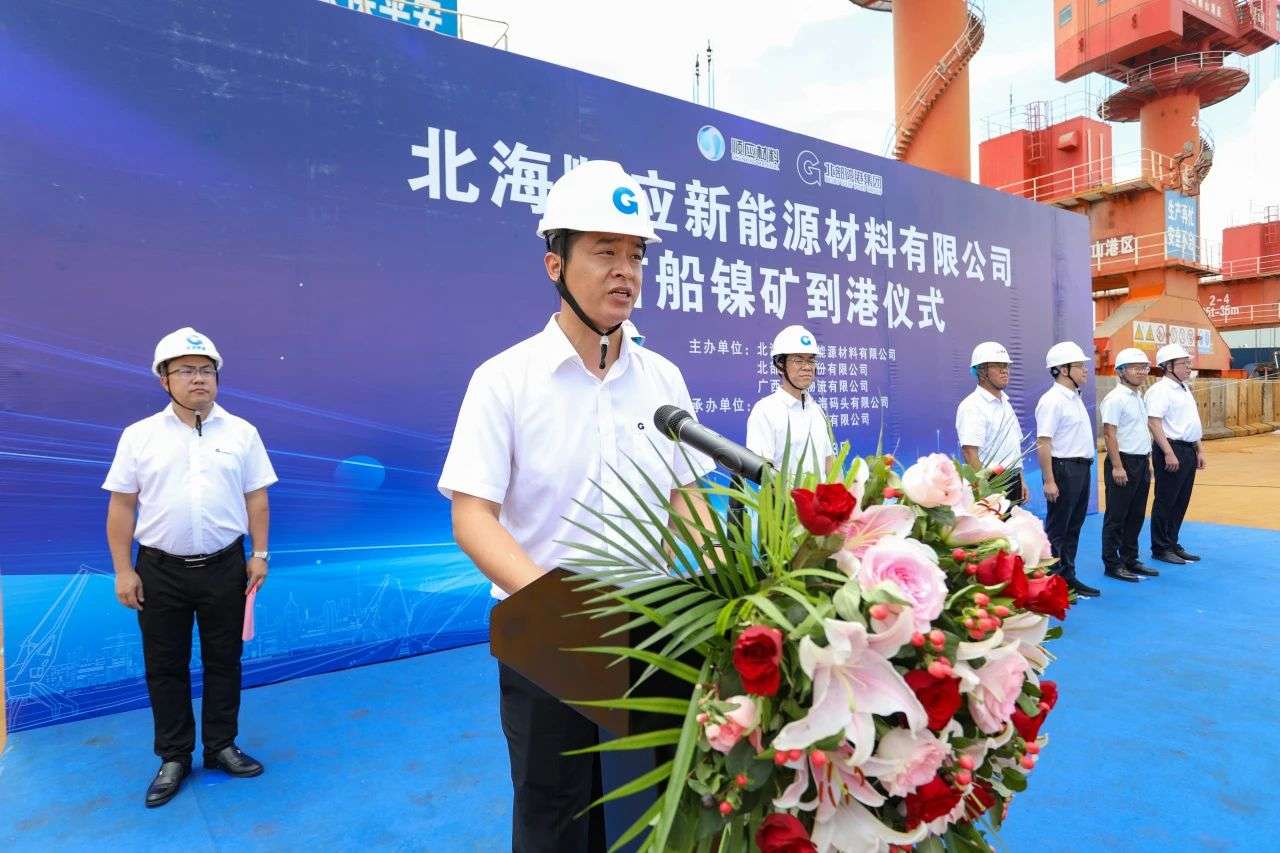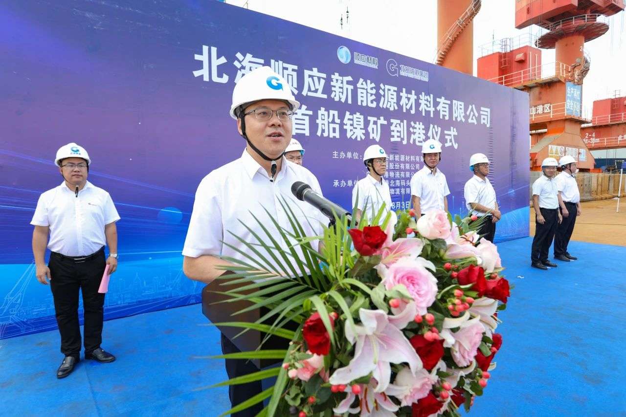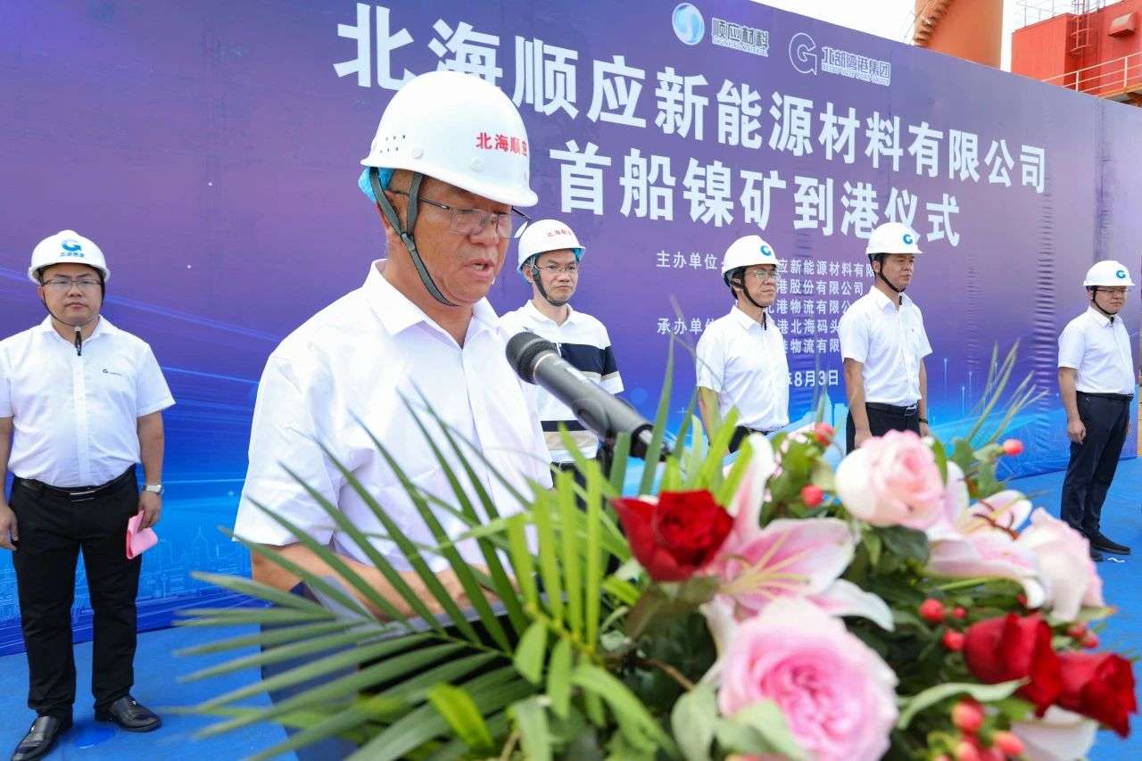 北部湾港北海码头有限公司党委书记、执行董事、总经理方健力,宣布北海顺应新能源首船镍矿开始卸货