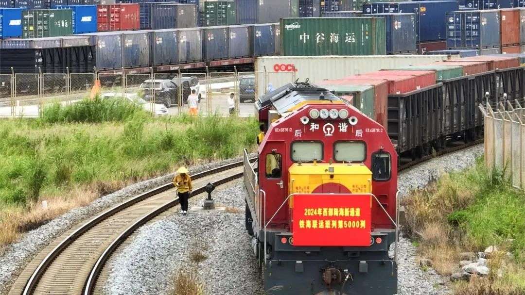 6月14日上午,一列满载着新加坡聚乙烯以及国内白云石、高岭土等102个集装箱的海铁联运班列,从钦州铁路集装箱中心站缓缓发出驶向重庆小南垭站,至此,2024年西部陆海新通道海铁联运班列已完成5000列,折合25万TEU(标箱),同比增长20.8%,这标志着上半年目标提前16天完成,为全年完成10000列战略目标任务奠定坚实基础。